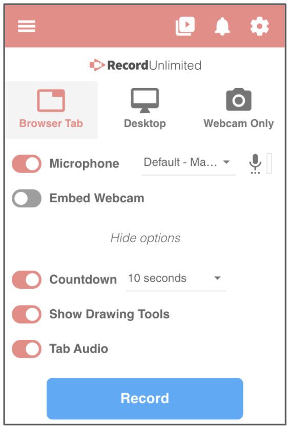 When you click on the extension, you will see your three recording options: Browser Tab, Desktop and Webcam Only.