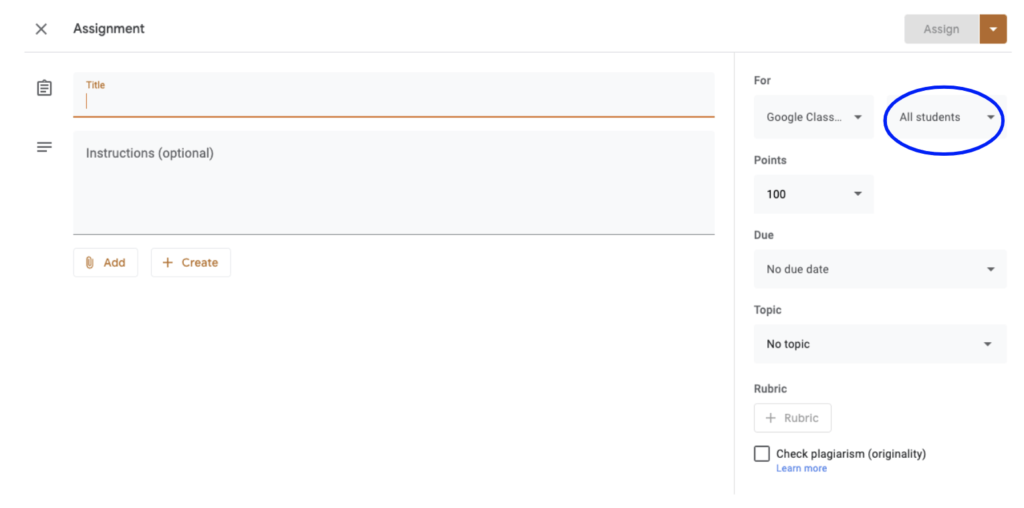 In the Classwork tab, you can actually post/assign work individually, it doesn’t have to be whole group. This can be done within the settings for whatever material, assignment, etc. that you are posting.