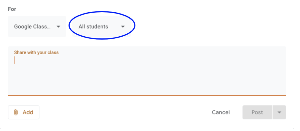 It will default to “All Students,” but if you click no the drop down, you can select the specific students that you want to view that material or assignment. Only the students selected will be able to view that material or assignment.