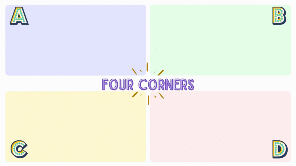 Four Corners is an absolute classic activity, especially in the face-to-face classroom. You can use it for any type of opinion discussion where students are selecting between four different options. Typically, your students would move to one of the four corners in the classroom and then be given a few minutes to discuss with their peers about their choice.