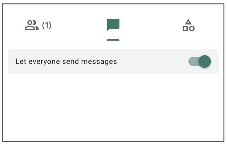 This section of the Google Meet is fairly straight forward. This is where students can type and read messages. This is also where you can quickly toggle on/off the ability for everyone to send messages.