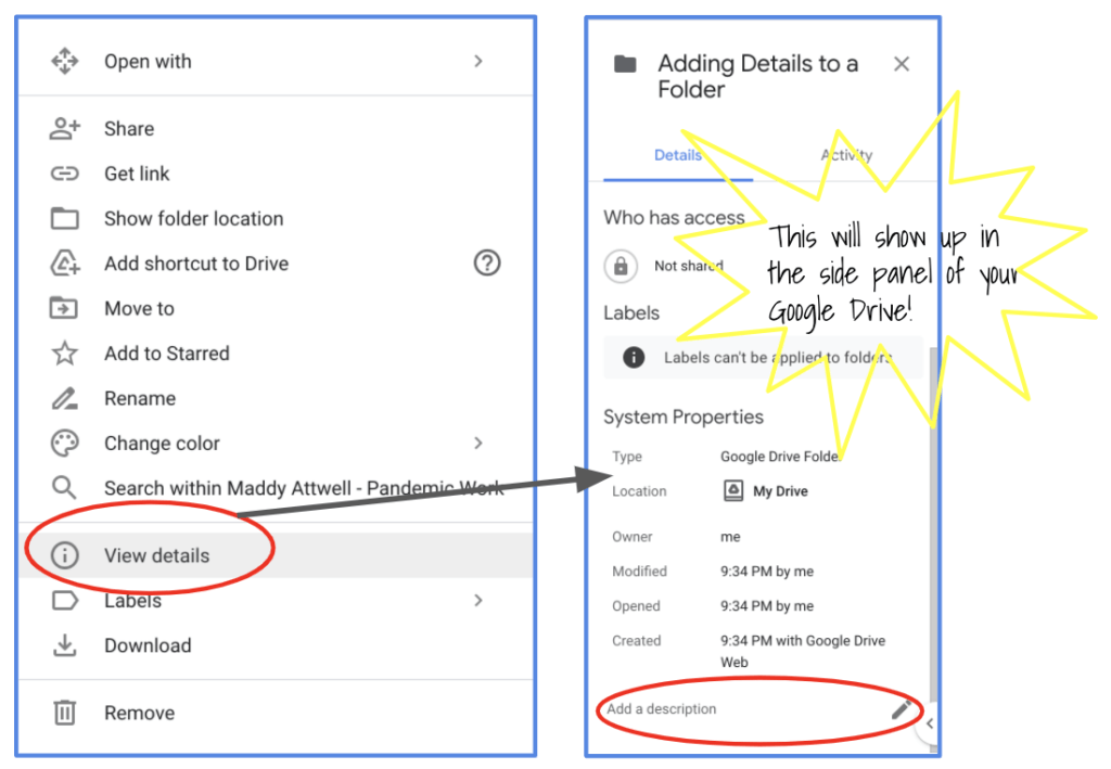 To add a description, right click on the folder; click “View details.” The adding details will open up in the side panel of you Google Drive.